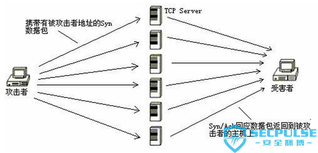 真实TCP服务器发送TCP的SYN包,而这些收到SYN包的TCP server为了完成3次握手把SYN|ACK包“应答”给目标地址,完成了一次“反射”攻击,攻击者隐藏了自身,但有个问题是攻击者制造的流量和目标收到的攻击流量是1:1,且SYN|ACK包到达目标后马上被回以RST包,整个攻击的投资回报率不高。